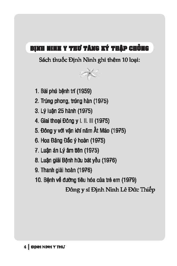 Cuốn sách “Định Ninh Y Thư – Tăng Ký Thập Chủng” do Đông y sĩ Đinh Ninh Lê Đức Thiếp biên soạn là một tài liệu quý trong kho tàng y học cổ truyền Việt Nam. Sách được in theo bản Long An năm 1992, đồng thời bổ sung và hệ thống lại các bài thuốc quan trọng trong bộ Sách thuốc Định Ninh, giúp người đọc dễ tiếp cận và ứng dụng hơn trong thực tế.