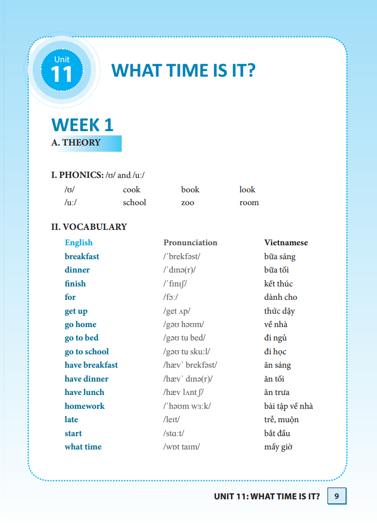- Phần Week 1: Tập trung vào việc thực hành kiến thức ngôn ngữ của các em. Các em sẽ được rèn luyện ngữ âm, từ vựng và ngữ pháp/ mẫu câu trong phần này.