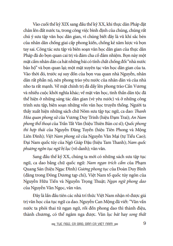 Đặc biệt, cuốn sách còn có phần biên khảo rất sớm (với tầm nhìn xa trông rộng) và rất giá trị về dân ca, bao gồm các loại hình như: hát trống quân, hát xẩm, hát quan họ Bắc Ninh, hát ghẹo Phú Thọ, hát ví, hát giặm Nghệ Tĩnh, hò Huế, dân ca miền Nam Trung Bộ, dân ca Nam Bộ…
